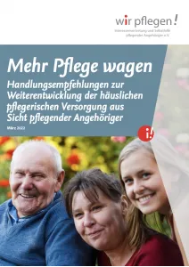 Bedarfsgerechte Entlastungsangebote für pflegende Angehörige, soziale und finanzielle Absicherung, bessere Informations- und Beratungsstrukturen und mehr Mitspracherechte in den pflegepolitischen Prozessen fordert wir pflegen e.V. mit den neuen Handlungsempfehlungen „Mehr Pflege wagen“ in Anlehnung an den Koalitionsvertrag.